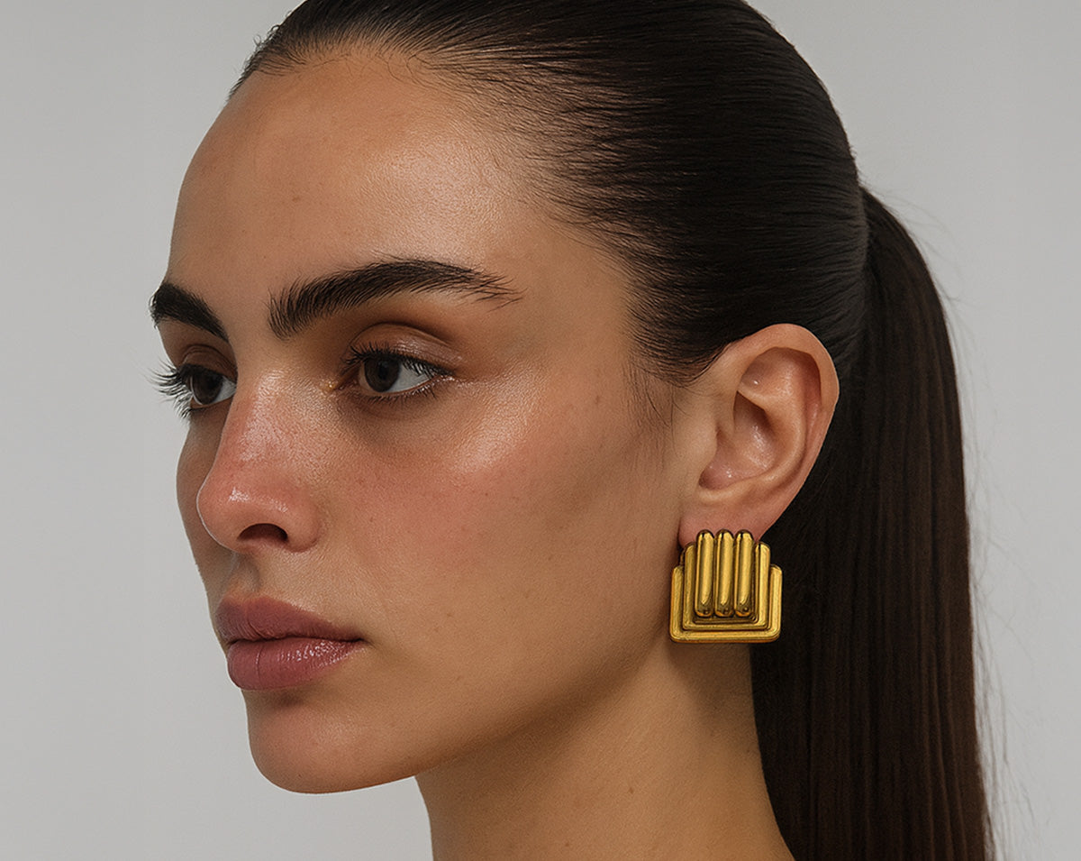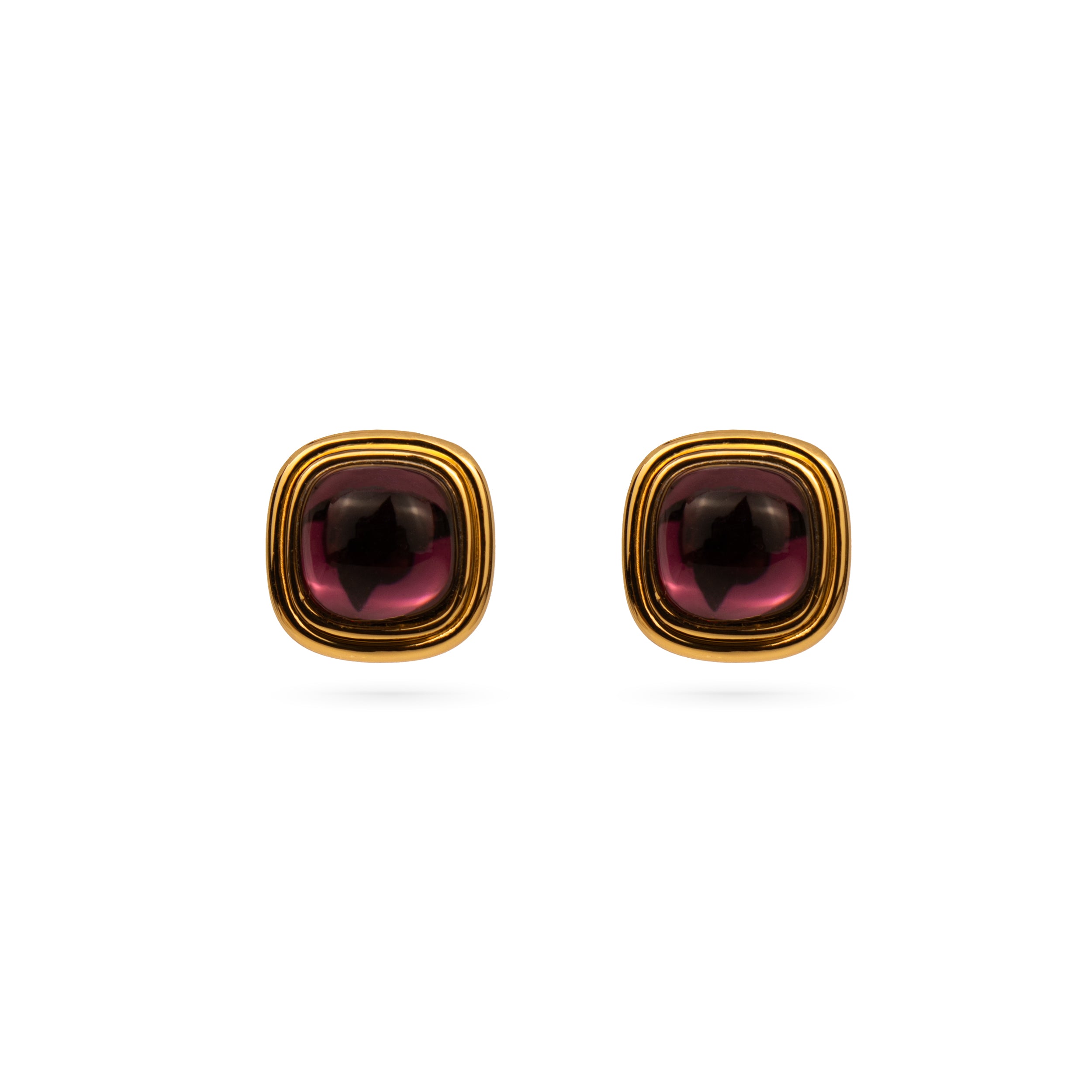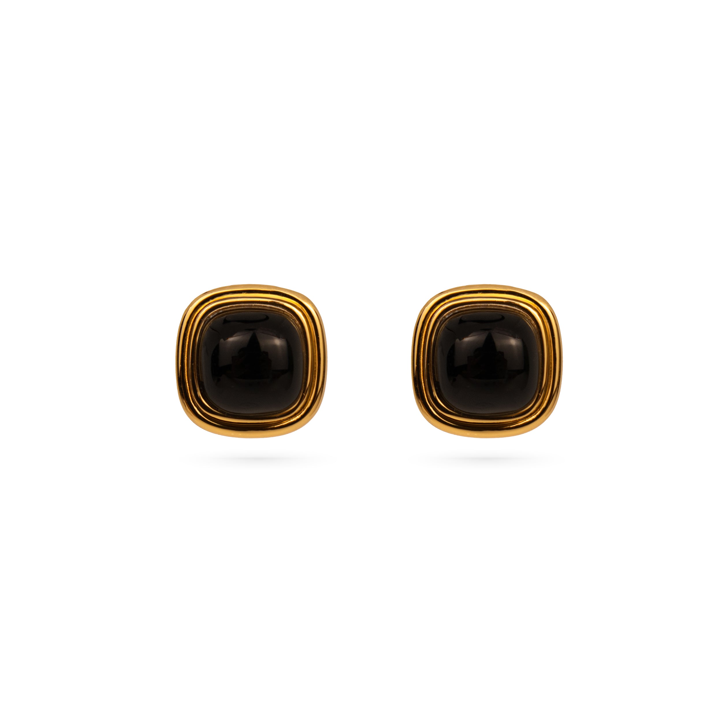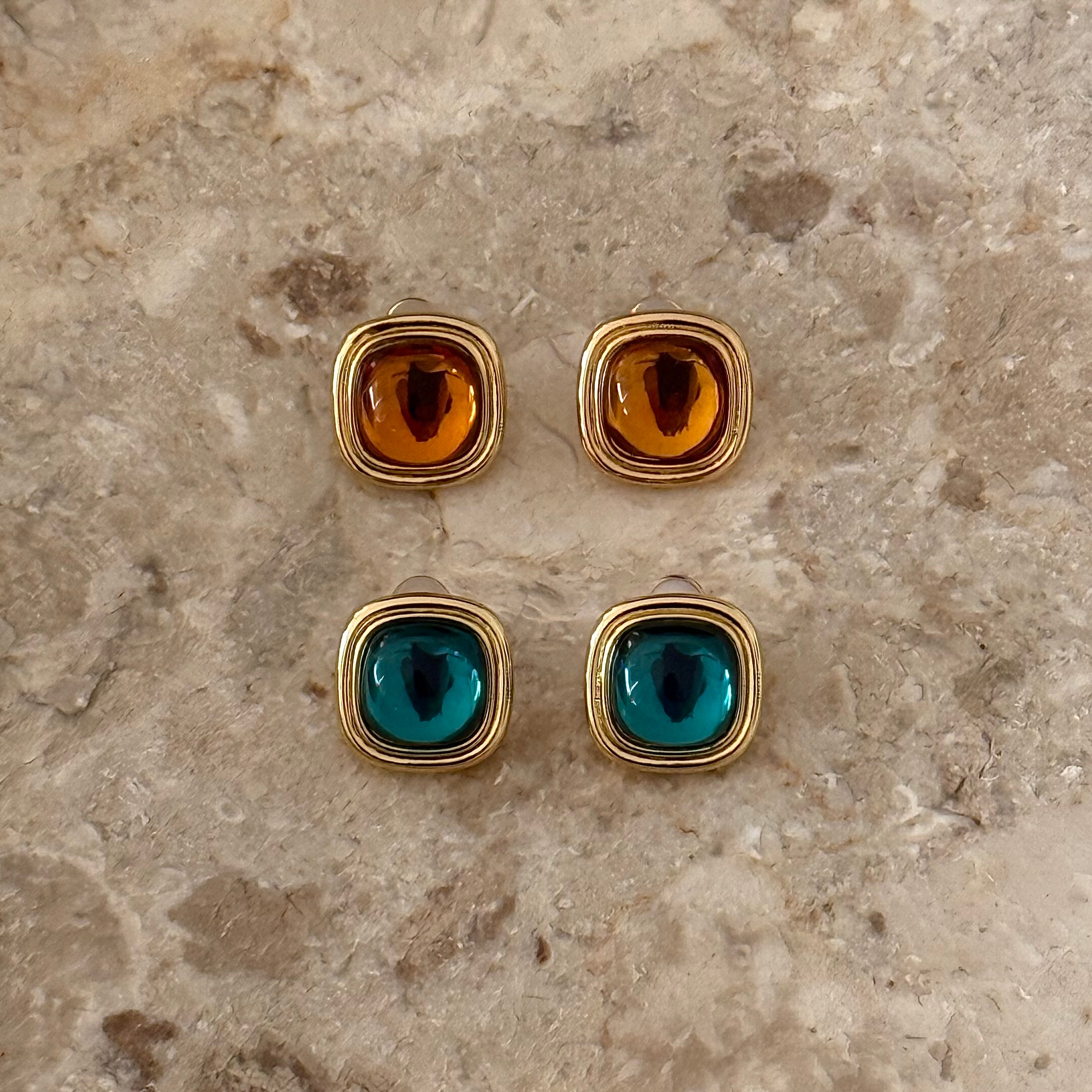 Introducing Matilda—where vintage elegance meets modern flair. Available in four vibrant shades— sophisticated black, deep teal, royal purple, and warm amber yellow. Each pair has a smooth, shiny center surrounded by a gold-tone frame for an elegant touch. Perfect for adding a pop of color to your outfits — Style Matilda to suit your mood and effortlessly elevate any outfit with a chic, polished finish